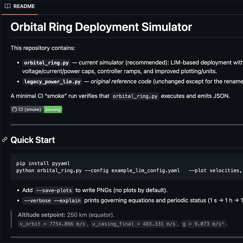 The code was crude but magical at the same time. This got me thinking: why not create an open source project on GitHub to optimize various space-based applications like orbital rings, space elevators, and mass driver systems?